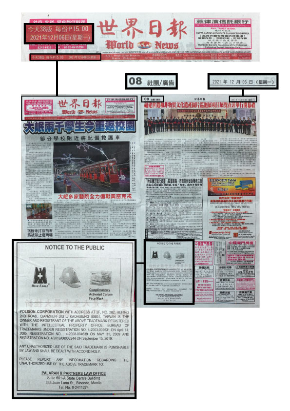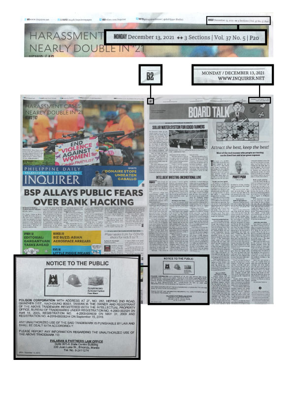 POLISON CORPORATION WITH ADDRESS AT 2F, NO. 282, HEPING 2ND ROAD, QIANZHEN DIST., KAOHSIUNG 80651, TAIWAN IS THE OWNER AND REGISTRANT OF THE ABOVE TRADEMARK REGISTERED WITH THE INTELLECTUAL PROPERTY OFFICE, BUREAU OF TRADEMARKS UNDER REGISTRATION NO. 4-2003-002531 ON April 14, 2005, REGISTRATION NO. 4-2008-004639 ON MAY 31, 2009 AND REGISTRATION NO. 4/2019/00008244 ON September 15, 2019.